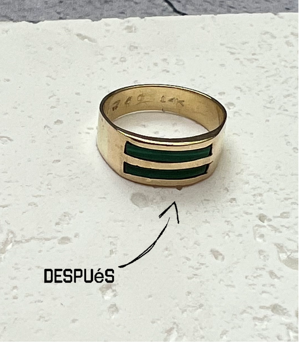 Nuestra recomendación: Agregar oro de 14K reforzando la parte delgada del anillo, incrustar piedras semipreciosas malaquitas las cuales se lapidaron y tallaron para el ensamble perfecto y finalmente hacer una limpieza general de la pieza.